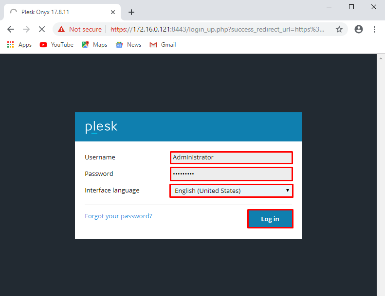14. pada kolom Login name kita masukkan Administrator (username Windows Server kita) dan pada kolom Password kita masukkan password Windows Server kita. Lalu pada kolom Interface languange kita pilih bahasa yang kita inginkan. Jika sudah, klik Log in.